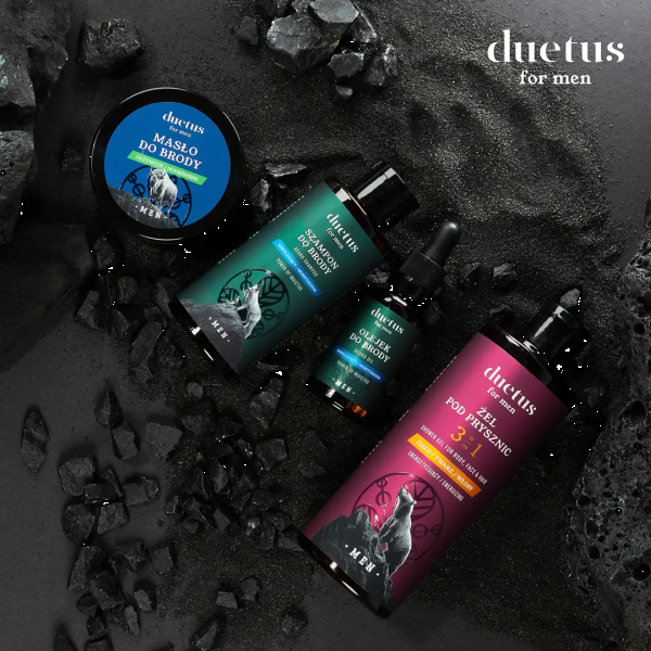 DUETUS FOR MEN meestele pakub kosmeetikat meestele, kes hindavad tõhusust, lihtsust ja mitmekülgsust. Selle sarja toodetes on ühendatud looduslikud koostisosad kaasaegsete valemitega, luues näole, kehale, juustele ja habemele mõeldud tooted, mis toimivad kiiresti ja intuitiivselt, välistades ebavajalikud hooldusrituaalid. Ikoonilistest parfüümidest inspireeritud iseloomulikud, maskuliinsed lõhnad annavad energiat ja enesekindlust, muutes enesehoolduse enamaks kui lihtsalt igapäevaseks harjumuseks. Avasta looduse jõud ja vaata, kui lihtne enesehooldus olla saab.